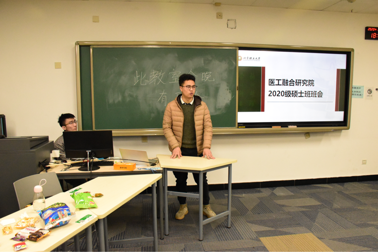 班会首先由班长张旭同学发言,他阐述了医工融合研究院于北理工的意义,以及作为研究生应有的使命和担当,希望同学们在今后的学习和生活中能够相互关心,使班级成为一个团结友爱的大家庭。