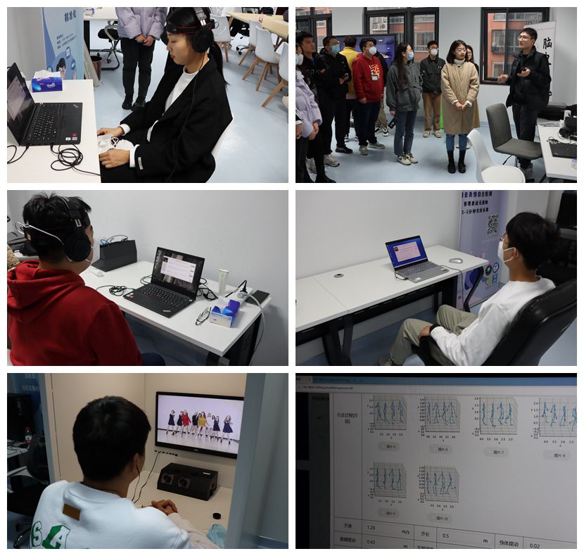 活动主要分为参观和体验两个环节。同学们体验了六款检测仪器。一是无扰式抑郁步态采集系统,通过建立肢体动作行为与抑郁之间的关系模型,实现对抑郁障碍的精准识别。二是无扰式疲劳状态、精神压力评估座椅,利用耦合心电技术,对精神压力的识别准确率达到75%以上。三是基于移动智能终端的抑郁水平评估系统(APP),通过构建时空特征的语音表情双模态融合方法高效识别抑郁状态。四是基于眼动的抑郁情绪评估系统,设计了时空密度聚类的I-SO注视识别算法,通过表情和眼动融合分析高效识别抑郁情绪。五是便携式三导脑电抑郁障碍识别系统,通过构建多类型EEG特征的抑郁识别有效生理指标,挖掘群体内共性及群体间差异性,对于抑郁障碍的识别准确率达到90%以上,其设备已经获得国家二类医疗器械许可证。六是实时生物反馈迷走神经电子针灸仪(二类医疗器械许可),通过构建实时生理指标反馈模型,建立抑郁障碍疗效评估指标体系,实现了对抑郁障碍非药物干预效果的纵向跟踪,其治疗有效率高达80%以上。
