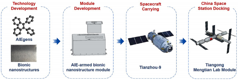 在轨试验期间,该装置将对舱内微生物样本进行在轨采集与快速分析,进一步丰富空间微生物菌种资源数据库,助力构建超高灵敏度、超快速的空间微生物检测平台。其中,AIE融合仿生纳米抗菌模块利用AIE材料在聚集状态下发光增强的特性,实现对微生物群落与生物膜的高灵敏度、高稳定性荧光成像,并结合仿生纳米结构激活即时杀菌机制,可在微重力环境下完成对病原体的快速识别与清除(图1)。该载荷装置于2025年7月15日通过天舟九号货运飞船成功运抵中国空间站,后续已完成在轨部署(问天实验舱)并陆续开展相关在轨试验。